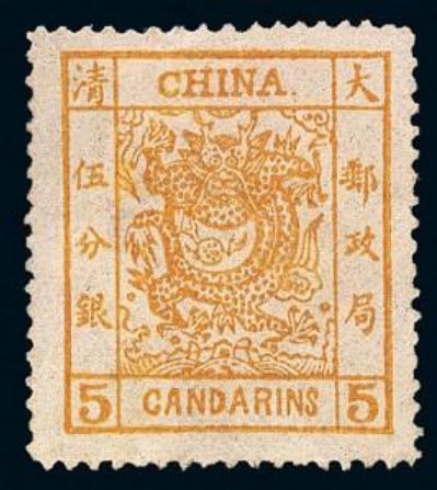 邮票上“大清邮政局”五个字十分醒目(其实此时清朝的邮政系统还没有建立起来);图案中的“大龙”两目圆睁,腾云驾雾,呼之欲出;上方标有“CHINA(中国)”,下方标有“CANDARIN(S)(海关关平银分银)”字样。